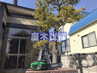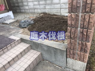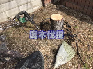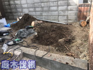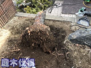 庭木の伐採をさせていただきました。このあと木の根を切断し、単管をテコにし伐根を試みましたがビクともせず応援を呼び何とか伐根しました。伐根が必要な場合はすぐに抜かずに木が枯れてから抜くのをお勧めします。