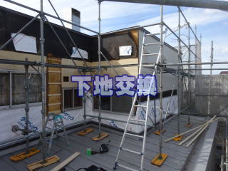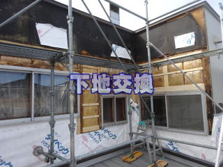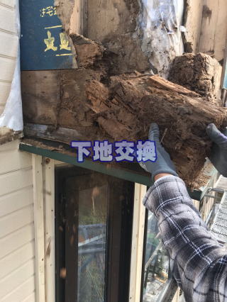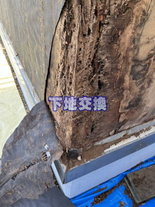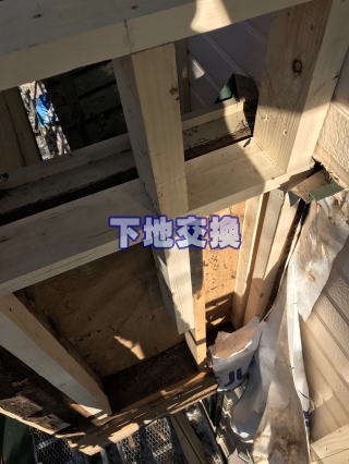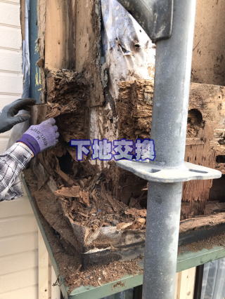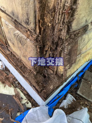 外壁撤去後の壁下地を確認いたします。雨等で下地が弱くなった後にアリが巣を作ってしまった状況です。下地の悪い部分を撤去し、補修及び交換していきます。
